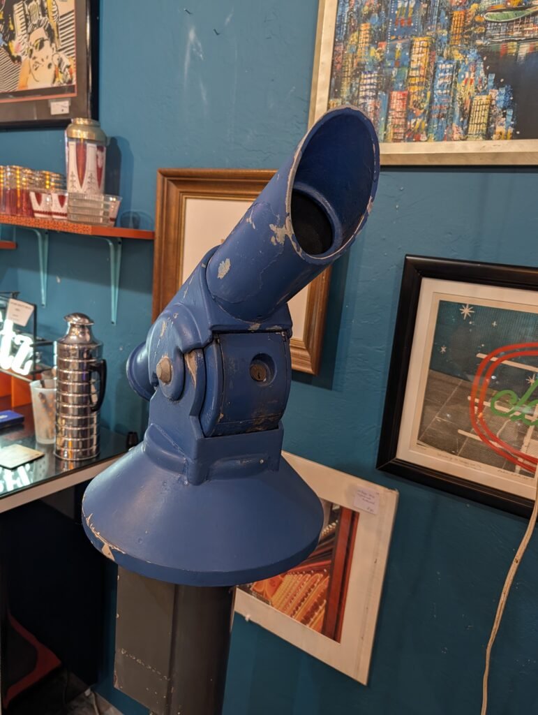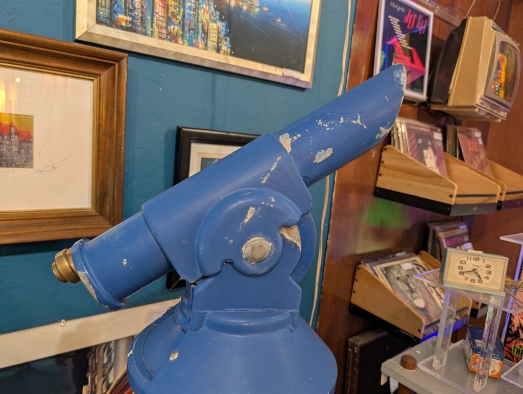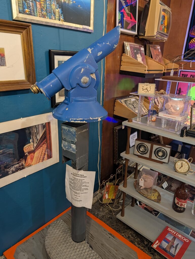 The asking price is $995.The telescope is offered through Jet*Set Laboratories — “The Science of Swank!” — which is Matt White’s dealer brand at Vignettes. Matt is something of a resident mad genius in the store. His specialty is taking objects built for one purpose and reimagining them as something else entirely. He might gut a vintage television set and convert it into a cocktail bar, or strip out the old tube works and rebuild it around modern technology. The original form stays intact, but the function is transformed. It’s part salvage, part invention, and part showmanship.The zoo telescope fits right into that sensibility. It’s a piece of public infrastructure — the kind of thing thousands of kids pressed their eyes against on school field trips and family outings across five decades — now offered as a collectible conversation piece. If you grew up in San Diego, there’s a decent chance you looked through this very telescope.What makes an item like this interesting from a collector’s standpoint is the crossover appeal. It’s not just a piece of optical equipment. It’s a piece of civic memory, a physical artifact tied to one of the most visited zoos in the world. At under a thousand dollars, it’s the kind of thing that could anchor a room, a business lobby, or a private collection with a single object that tells a story all by itself.